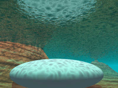 Démarrer Vue d' Esprit 2, et ouvrez la scène sous-marine du tutorial. Vous pouvez faire un premier rendu et constaterez qu' il n' a pas d' effet "caustic". Par contre un bon point l' éclairage est directionnel (tous les rayons sont parallèles). C' est l' éclairage solaire standard de Vue 2. |